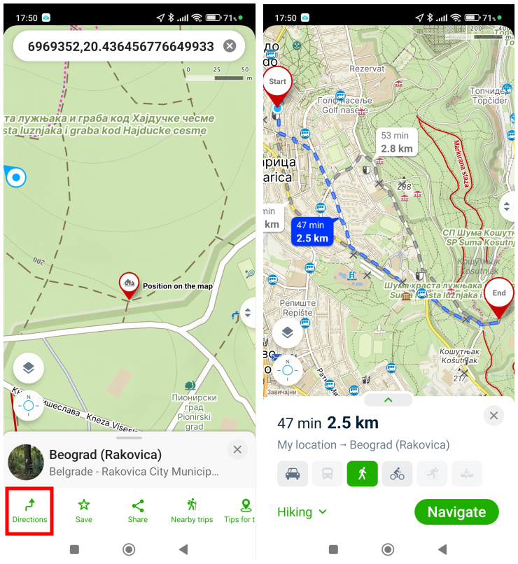 Once you have a saved point, navigating to it is simple. Clicking the "navigate-to-location" button for a saved location, Map Marker opens a dialog with available navigation apps and shows the marker location in the selected app. You can then trigger navigation to that location in that app. This keeps Map Marker focused and lightweight, while still letting you rely on a full navigation engine when you actually need turn-by-turn directions. In our example below, we used Mapy.com as the navigation app.